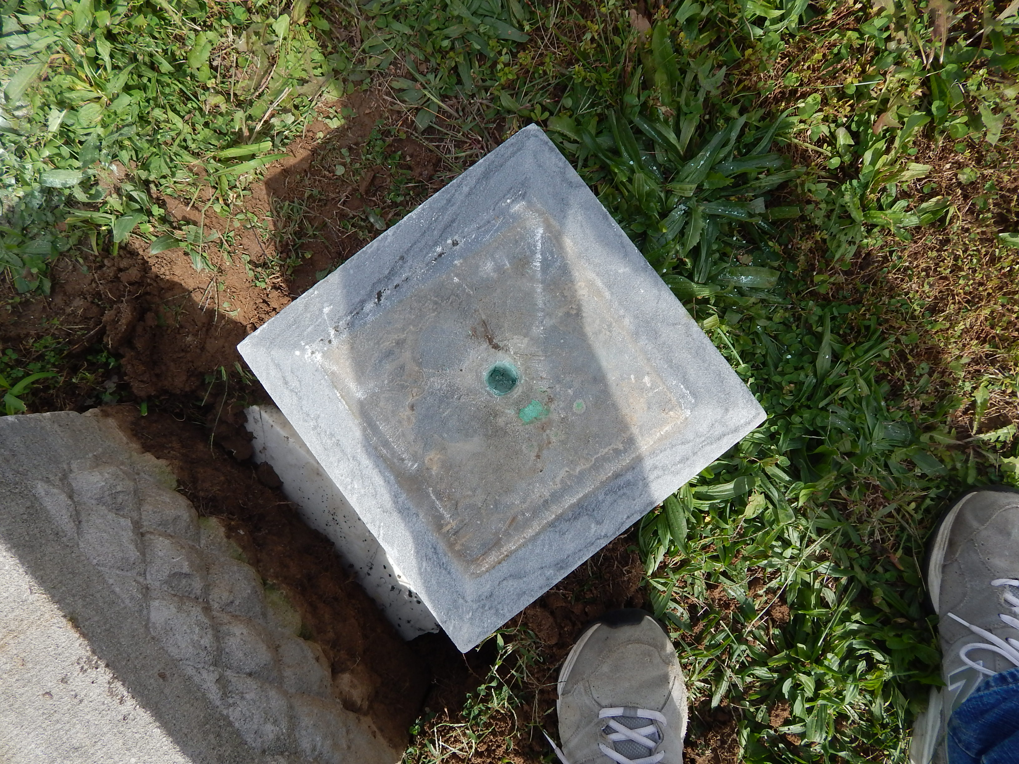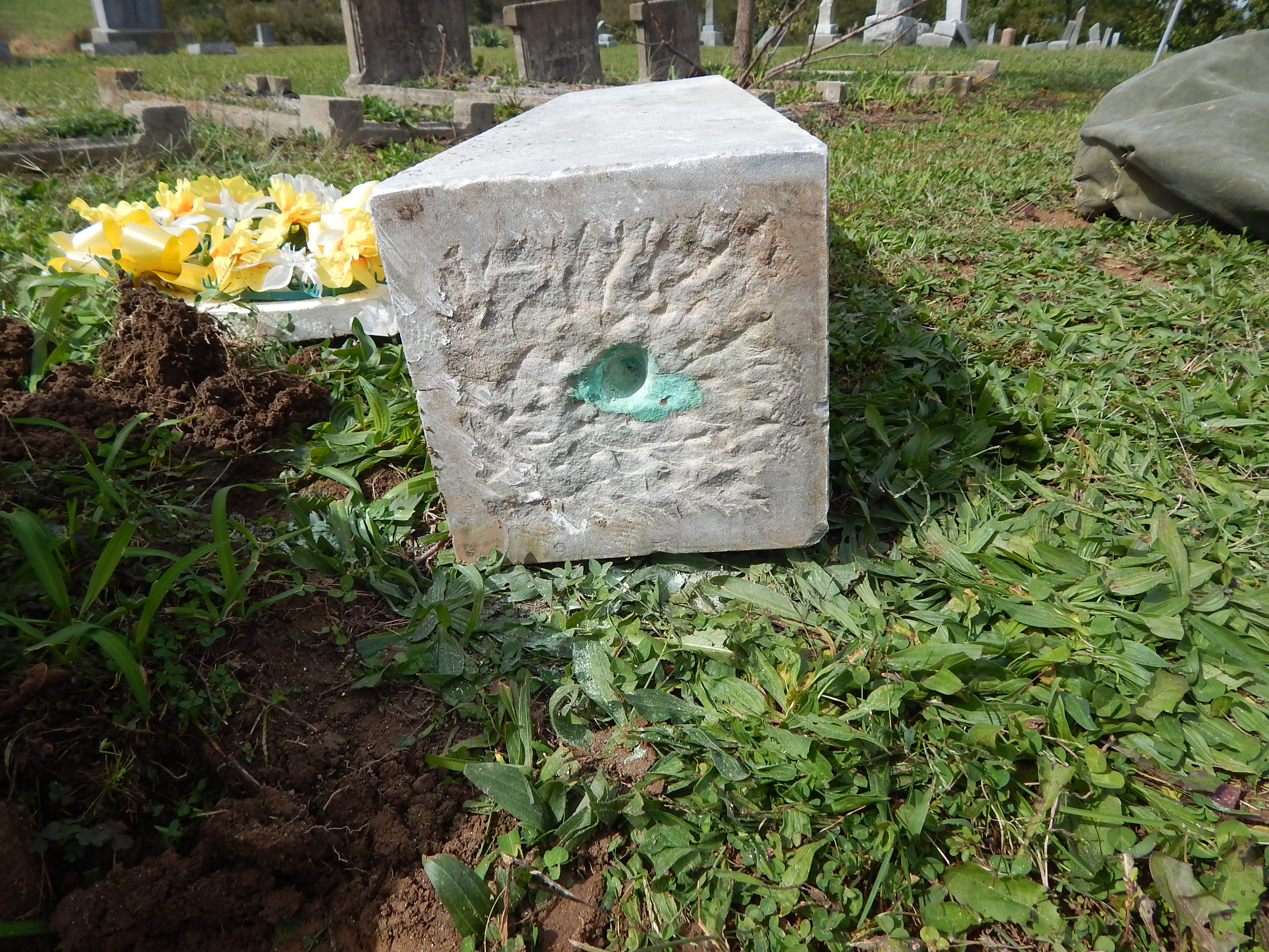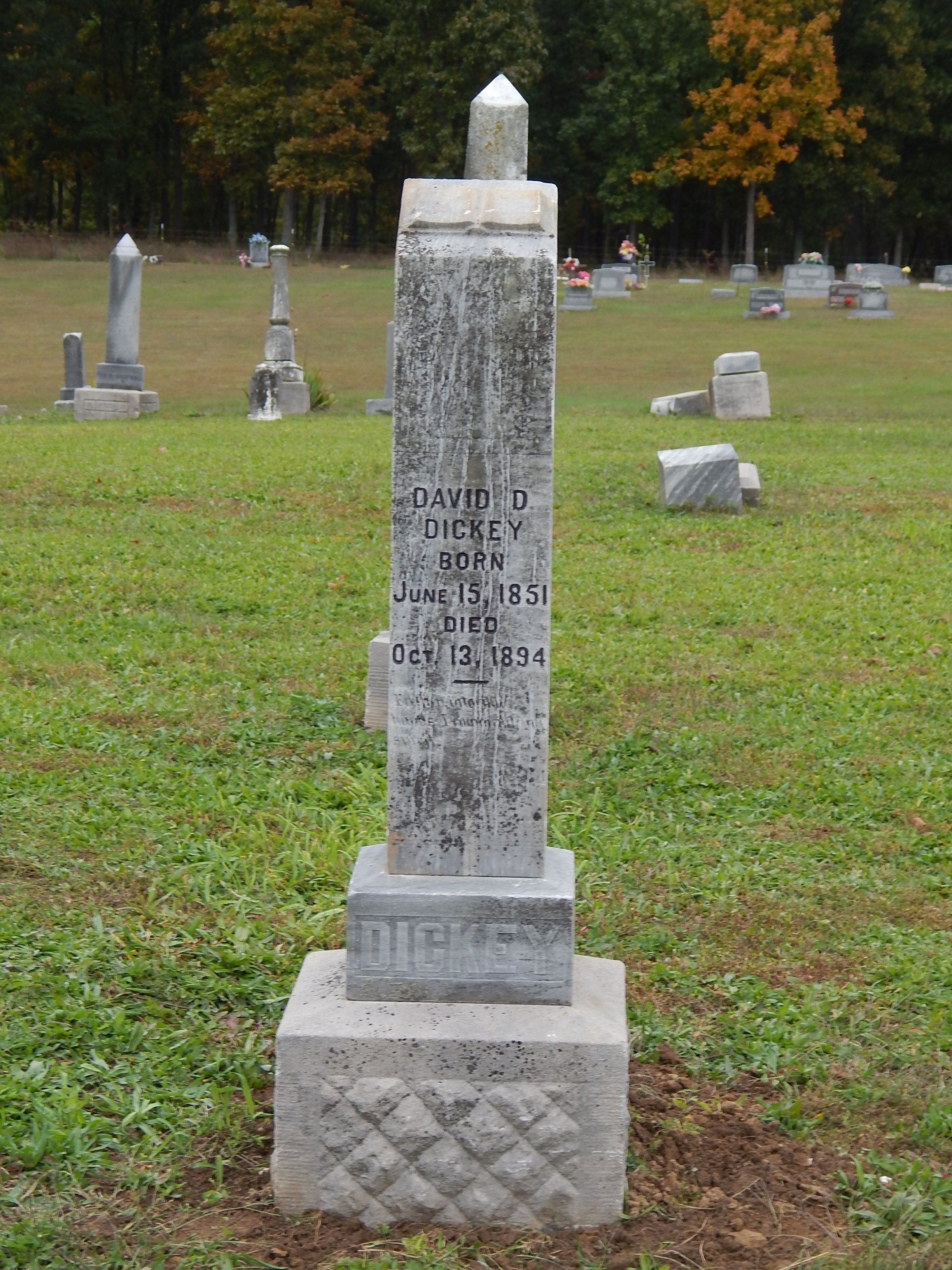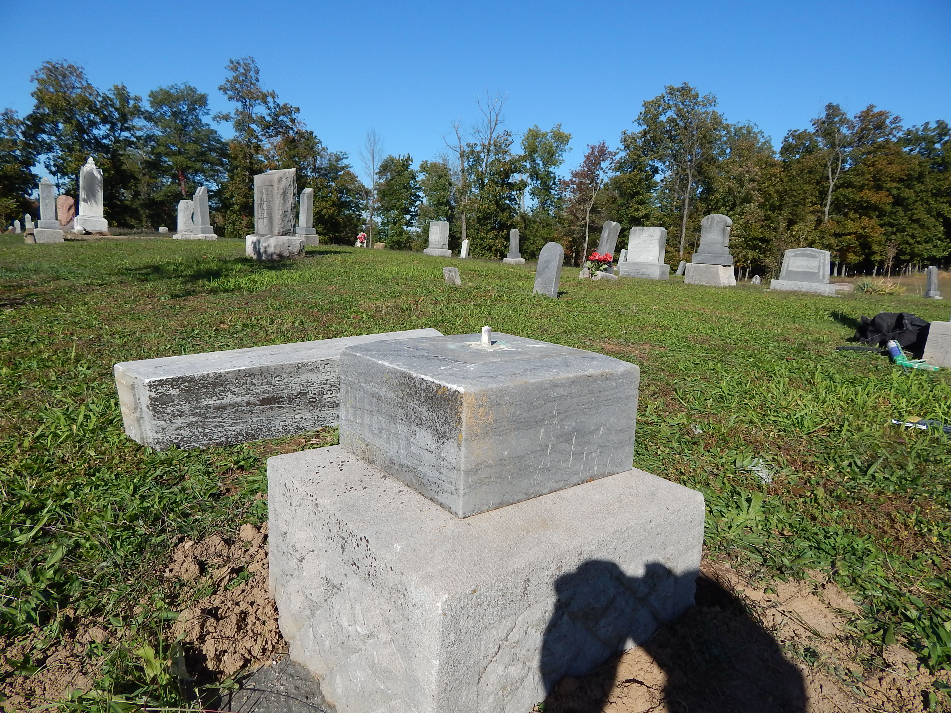On my most recent trip to Wayne County, I decided to fix five tombstones in the Dickeyville/Arrington Prairie Cemetery. For many years I have gone to Dickeyville cemetery as most of my family are buried here. The tombstone of David D. Dickey (the son of Rev. David B. & Nancy A.S. Page Dickey) has been laying on the ground for close to 10 years now. I dug around the main monument base and leveled it and reinforced it with steel bar and then poured close to 80 lbs. of cement under it. Then the surname base that holds the actual tombstone had to have the bored hole cleaned out and a new rod put in which holds it to the tombstone. I used solid core aluminum. The green patina indicates the original “rod” was rolled copper. So I let all this set 24 hours and then returned with monument adhesive and hoisted the tombstone onto it’ surname base glued the monument onto its surname base. Boy was that thing heavy I only weigh about 140 lbs. and I think it weighed more than I do. But