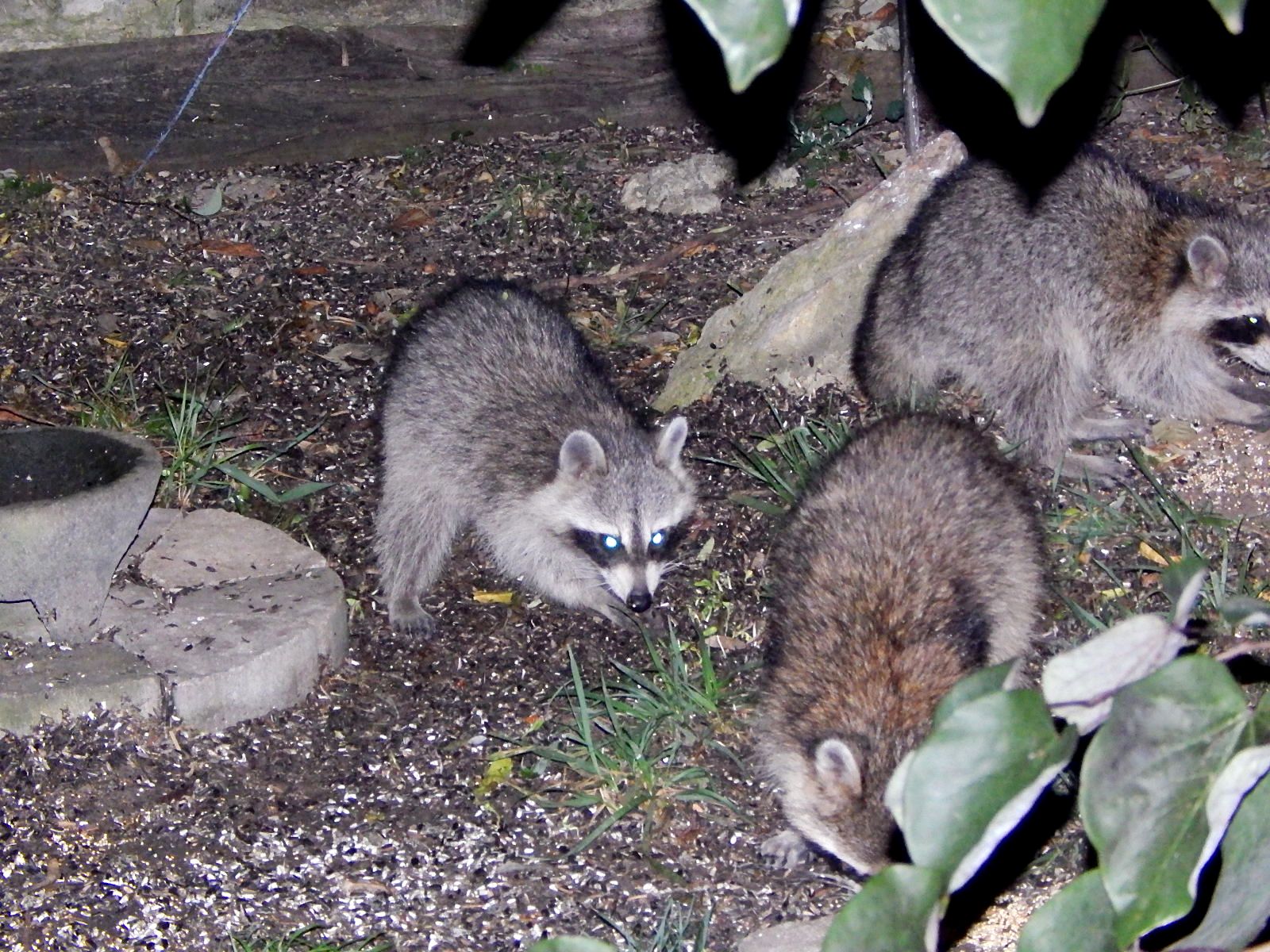 These young baby males were accompanied by an older male. They would come down at night to feed on seed and nuts at our feeder. The one looking at the camera I named Tag a Long. He kept following me around at night and I had to keep shooing him back with his pack.