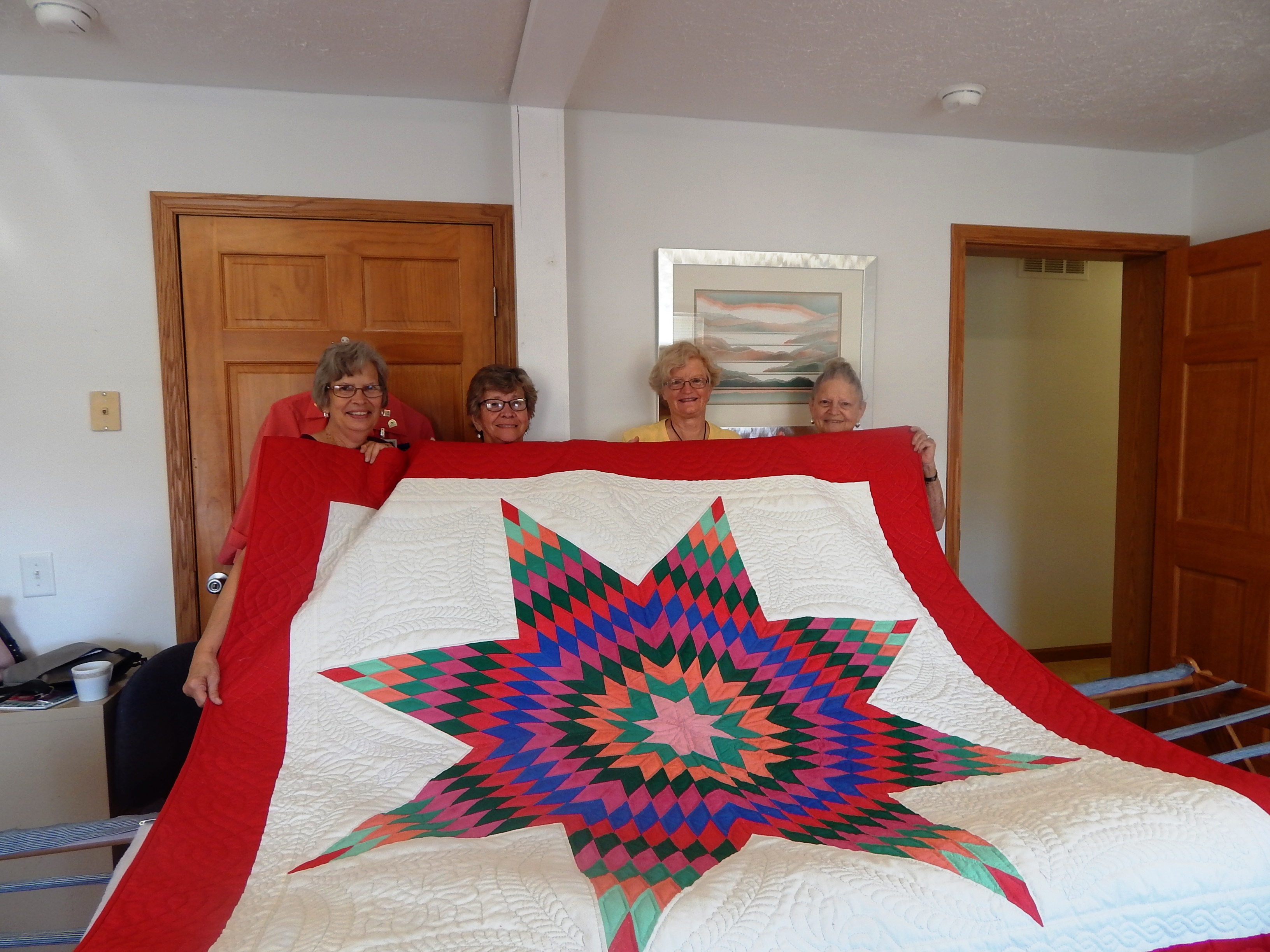 Well I began looking for someone to finish the quilt. Here in Missouri a lady wanted to run it through a bedspread machine to stitch it. So, it wouldn’t be a quilt it would be a bedspread, NO! Finally, I spoke to my oldest and dearest friend, Betty Beeson a contributor here at Faded and she got me in touch with Joy Coles and the ladies of the Fairfield Memorial Hospital Auxiliary Quilters. These ladies with over 6,000 hand stitches, new border fabric, fill, backing, and most important the love of their craft took this forlorn quilt and turned it in to a cherished masterpiece whose history and story shall live on. Thank you, ladies, for making a dream come to life.