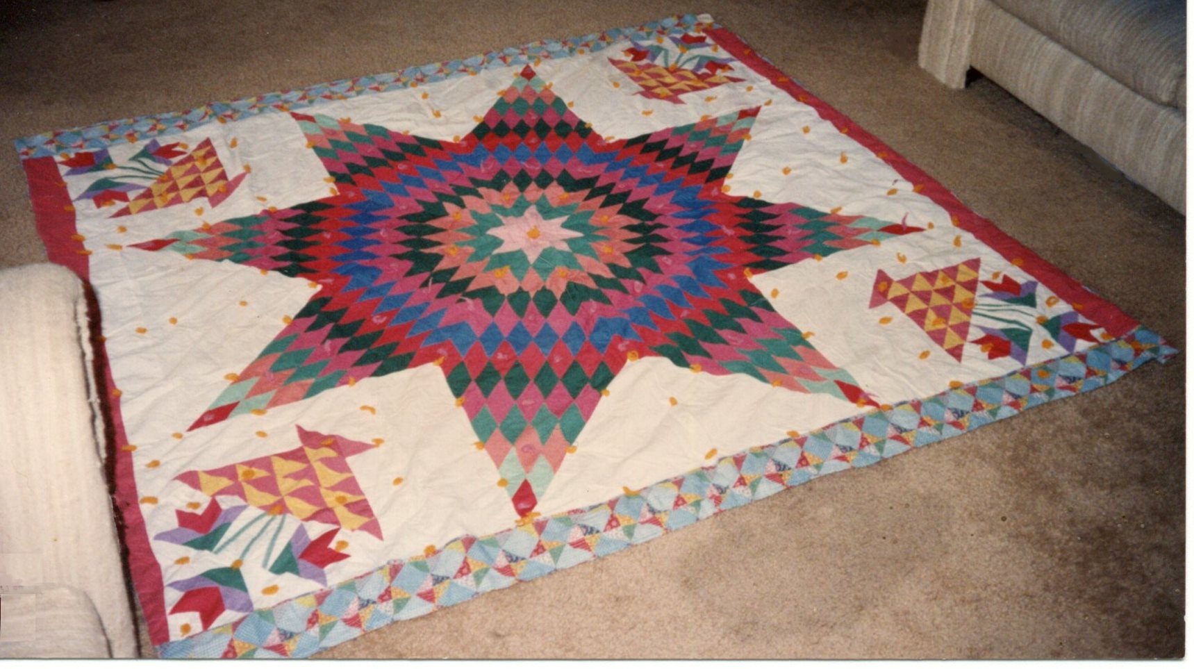 By the time I moved to Florida in 2003, I ran into a group of quilting ladies. By that time, I had removed the calico material, quilt fill and backing. Just the quilt top remained. I showed the ladies and they were aghast that someone had put the baskets of tulips with the star. They said it was bad luck. I thought who needs more bad luck, so I sat and carefully removed the baskets of tulips and then only the star remained.